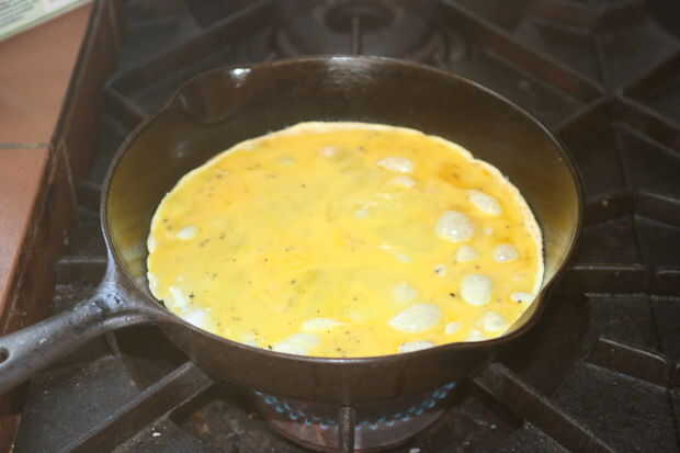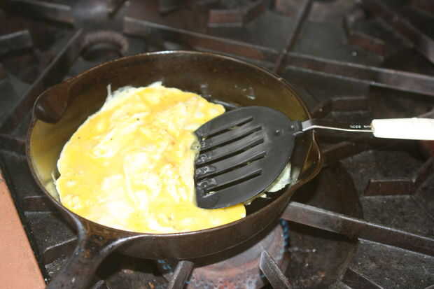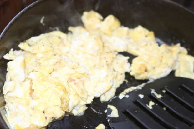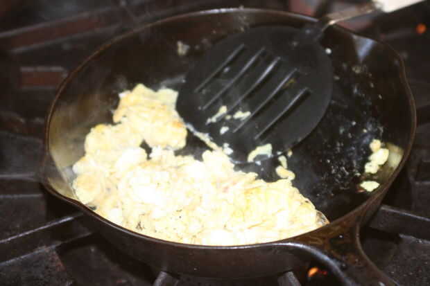 Ahora tome su espátula y empezar a raspar alrededor. Dispersión de los huevos, extiéndalas, reunirlos, desordenarlos!