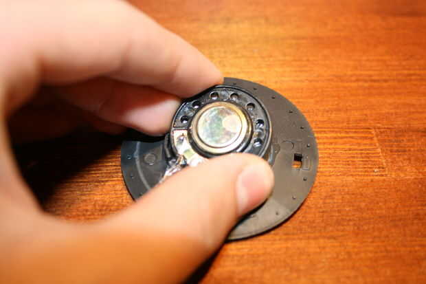 Esa cosa de color latón en el centro de la placa, contiene el imán. Si no está seguro de qué parte está el imán, probarlo con un otro imán o algo de metal. Utilizar algunos músculos y arrastre el altavoz entero apagado.