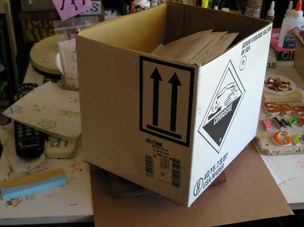 Para hacer esta roca, comencé con una pequeña caja de cartón corrugada. Utilizo un montón de cartón, así que tener un buen suministro a mano también. Periódicos viejos para relleno, algún alambre de pollo y por supuesto de cemento/hormigón herramientas tales como separadores, paletas, cubos, acceso a agua, mezcla de cemento, arena y mortero, etc..