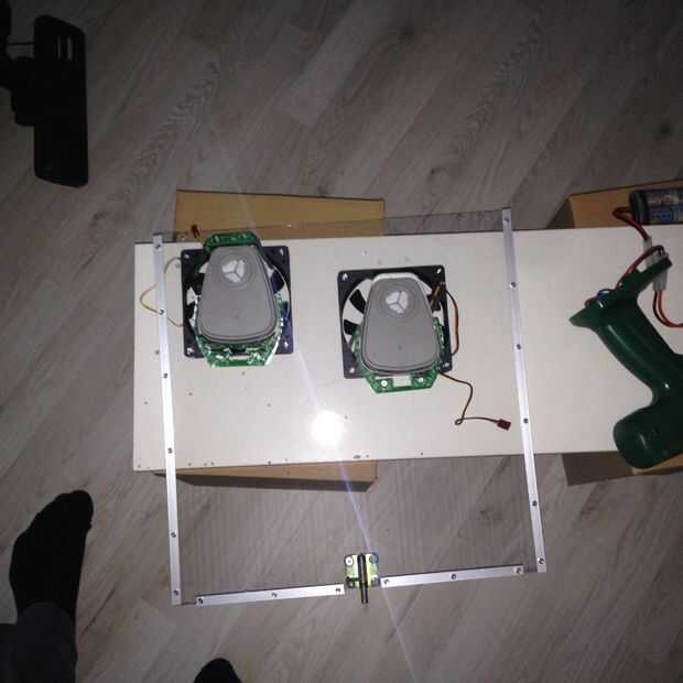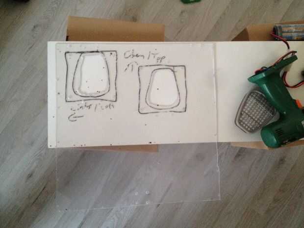 Para construir la puerta, tenemos que cortar un trozo de vidrio acrílico a la medida exacta de la plataforma (en mi caso 40 x 40 cm) y perfore unos agujeros para montar todos los componentes.