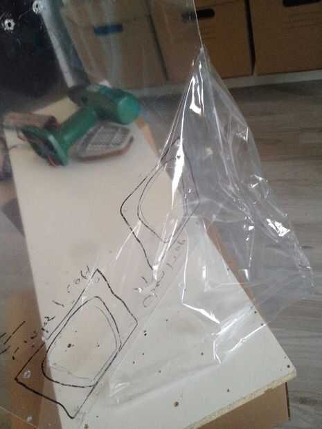 Ahora necesita taladrar los agujeros para las bisagras y la cerradura, por lo tanto colocar en el vidrio acrílico, marcar la posición de los orificios y perfore les demasiado.