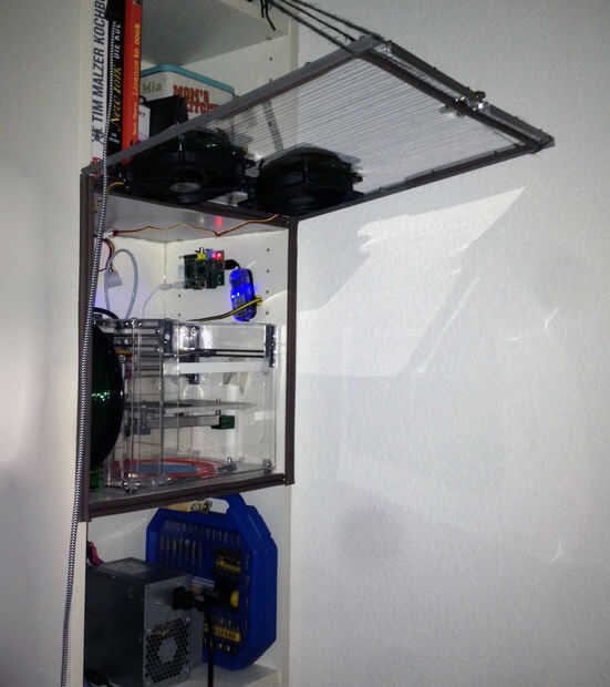 Envían los cables de los ventiladores a lo largo de la Junta del estante superior. Con el fin de obtener una derrota clara en la parte superior sería bueno colocar un tornillo en la parte superior. Este tornillo puede utilizarse para fijar algunos lazos zip en su lugar. Utilice este lazos zip para fijar los cables de ventilador y los otros en su lugar.