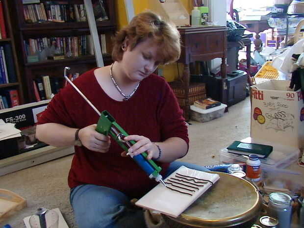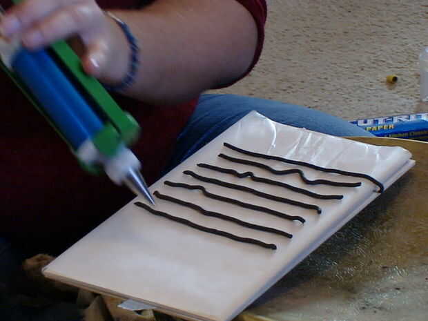 Chorro de unas líneas de masa. (Nota: usted puede encontrar que necesita un poco más de agua aquí; si es así, sacar la masa, añadir unas gotas más y vuelva a intentarlo.) Las líneas no será hermoso, y tomará algo de práctica antes de convertirse en competente. No te preocupes vamos a hacer en un minuto.