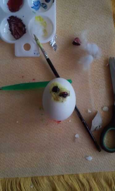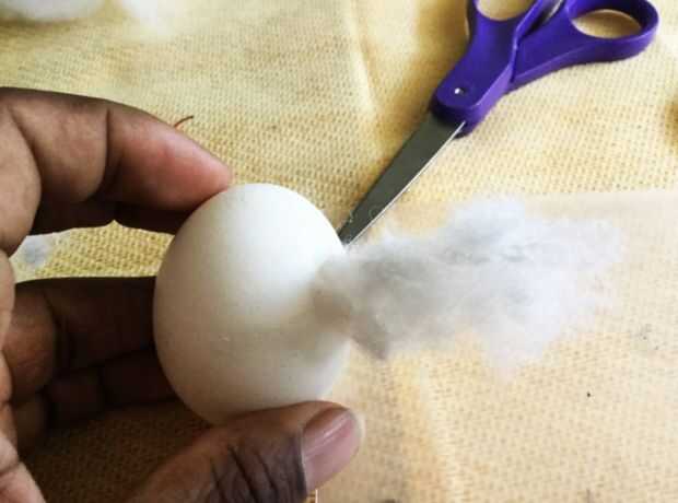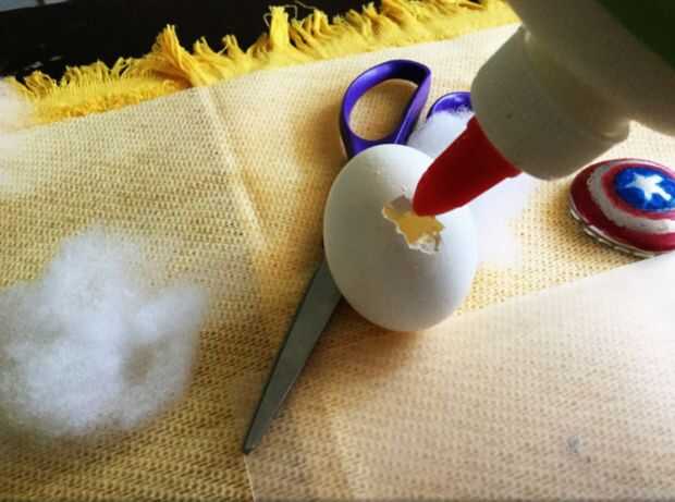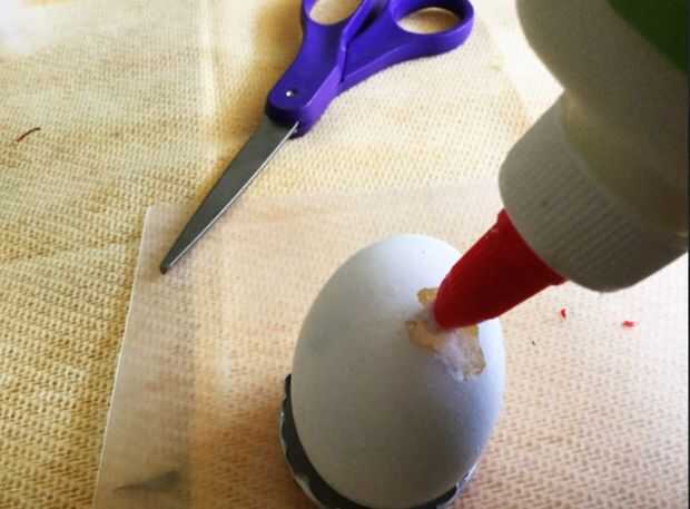 Después de que los huevos estén limpios y secos vierte pegamento en los huevos para dar la pelusa de algodón algo para ponerte en el huevo. Entonces la materia algodón en la licencia de huevo unos puff de algodón asomando de la grieta de huevo servirá como la cara más adelante. La cara debe ser lo suficientemente grande para el ojo y el pico para encolar el siguiente.