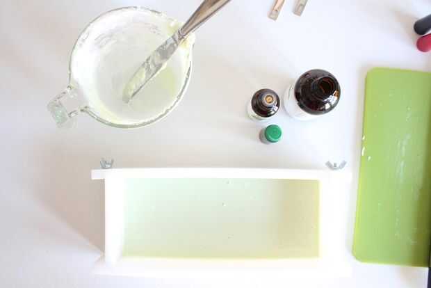 Una vez todo lo añadido en la base, querrá volver a verter en el molde de jabón u otro recipiente de plástico.