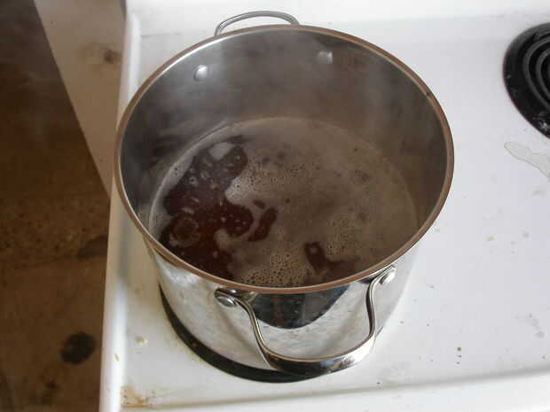 Con la grasa de tocino líquido y agua en la olla luego lentamente calienta la mezcla y lleva a ebullición lenta (hacer este proceso poco a poco para que no esparcen por todas partes). Me deje que se cocine a fuego lento para un poco más de una hora - en que momento reducido su volumen significativamente y visualmente apareció limpio - aunque no huelen mejor. Tome la mezcla de calor y transferirlo al refrigerador hasta que se solidifica otra vez.