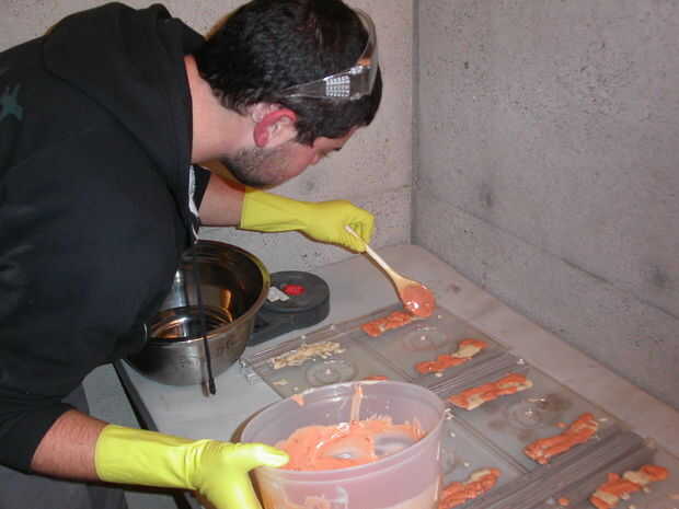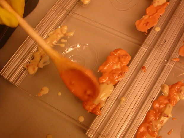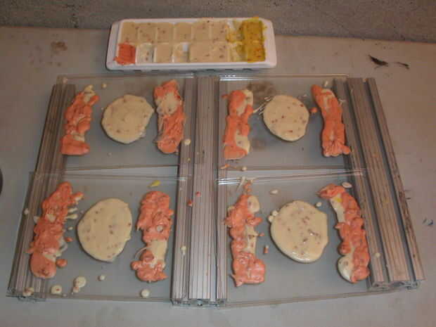 En primer lugar llenamos cada molde hasta la mitad del bacon con el jabón blanco. Luego volvió y rellena el resto con el rojo. Usé una cuchara para intentar mezclar los dos colores un poco en un intento de que se vea como tiras de tocino de carne y grasa. Sólo de esto funcionó. Me encantaría sugerencias de cómo conseguir marmoleo más preciso de la panceta, si alguien tiene alguna idea.