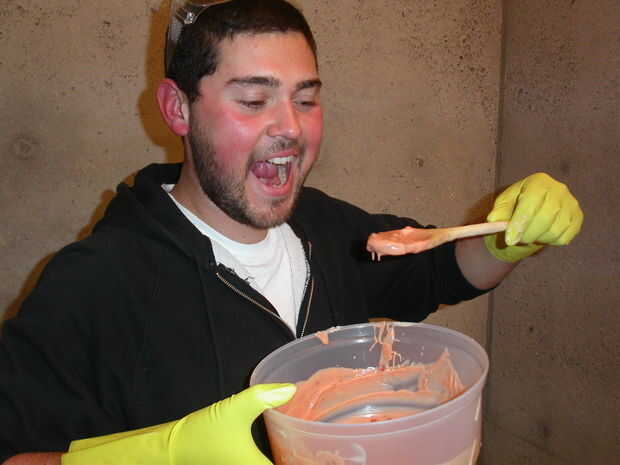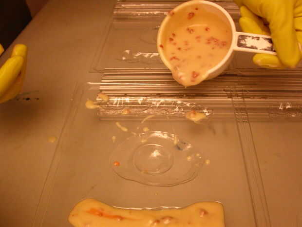 Con el tocino moldes llenos y todavía un montón de jabón en el recipiente de plástico, había vertido de parte de la mezcla de jabón blanco y se volvió amarillo con tinte. Mike y yo luego vertida que mezcla en la sección de yema de huevo de plástico moldes y luego rellena con blanco de eso. Esto realmente crea un bonito huevo frito!