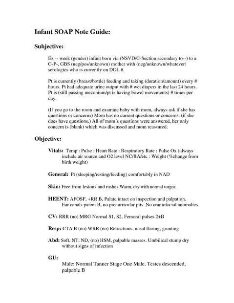 Mayoría de los hospitales los sistemas tienen su propio formato para escribir las notas de jabón entre las oficinas, pero todas ellas comienzan con pacientes nombre, fecha de diagnóstico de servicio y código de procedimiento (o pasos de acción). Después de este jabón notas se dividen en cuatro secciones, basadas en el acrónimo soap tema, objetivo, evaluación y Plan. Más notas de jabón se configuran en el formato en la figura 3 y están disponibles en línea para obtener más ayuda. Más información sobre jabón incluye una figura de un cuerpo humano, esto está presente para ayudar a ubicar con precisión las lesiones de los pacientes y para ayudar a los médicos diagnosticar con precisión y prescribir el tratamiento adecuado para proporcionar al paciente. Lisa Schwartz da la punta siguiente sobre "cómo" componer notas SOAP: "Aunque notas SOAP son normalmente corto y dulces, también deben exhaustiva y completa." (Schwartz) Usted debe Asegúrese de que toda su información es clara y fácilmente legible. En estas instrucciones lo ayudará a redactar una nota de jabón eficaz y correctamente formateado.