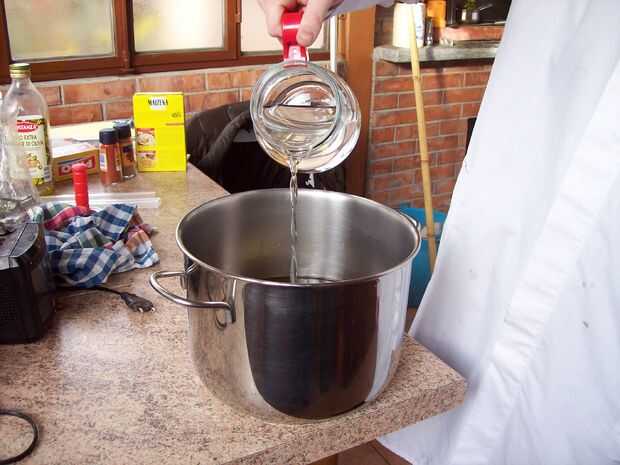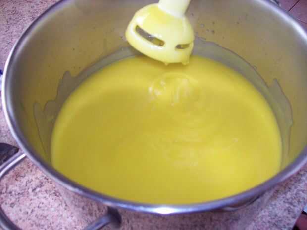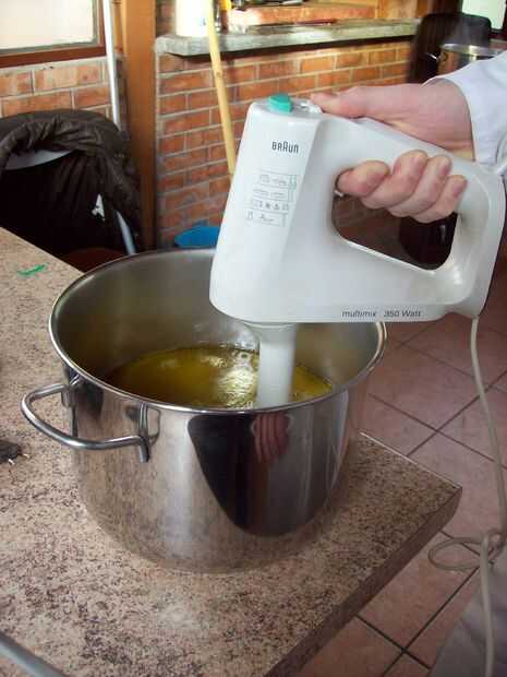 Cuando la solución de álcali es aproximadamente 40° c, lentamente agrega el aceite en la olla, que está a 40° C. Luego mezcle la solución usando la licuadora. Continuar mezclando hasta que la solución se vuelve como un gel. Este gel todavía es cáustico, ADVERTENCIA. Este gel se llama "rastro".
