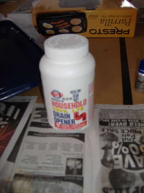 Ahora es un buen momento para poner en los guantes y gafas. Pesar los cristales de la lejía en un recipiente. Está bien usar plástico en este punto ya que los cristales no son mojados.
