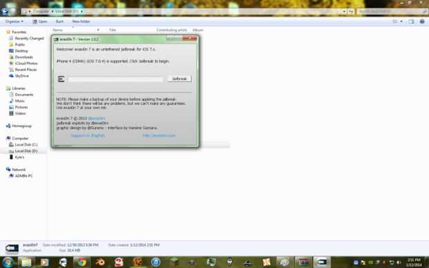 Evasi0n.com A partir de mi copia de nube desde aquíuna vez los archivos han sido descargados, abra en su herramienta favorita de archiving, generalmente WinRAR. Una vez abierto, extraiga el archivo .exe en un lugar y ejecutarlo. Funcionó una vez, debe mostrar una interfaz muy similar a la foto.