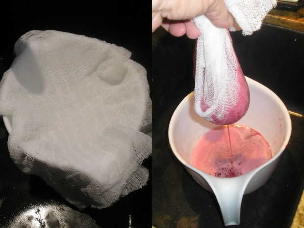 Una bolsa de gelatina puede utilizarse también pero la tela de queso funciona bien.  Trate de hacer una bolsa con al menos dos capas de tela para la mezcla del jugo/semilla pase a través.