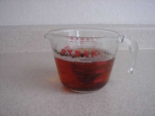 En primer lugar, poner los capullos de lavanda en un recipiente de pyrex y Vierta 500 ml (2 tazas vale la pena) de agua hirviendo. Empapar los cogollos durante 20 minutos o menos. Debería verse como té. Y huele muy bien. Asegúrese de que la tapa con papel plástico para evitar que el polvo se colocaba allí y para reducir la evaporación.