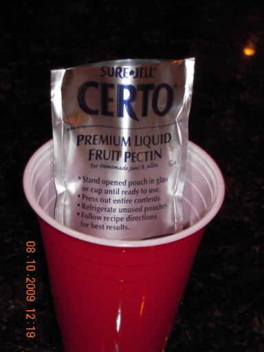 Mida el vino y el azúcar. Me gusta cortar la parte superior del paquete de pectina y ponga el paquete en un vaso o tarro cerca de la estufa. Esta manera, puede obtener la pectina rápidamente cuando sea necesario.