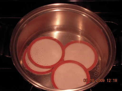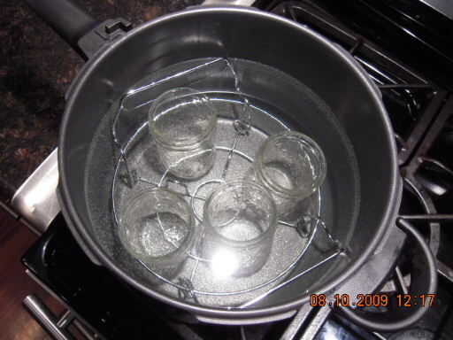 Lavar todos los recipientes, tapas y bandas en agua caliente con jabón y enjuague cuidadosamente. Poner los frascos en una olla grande con suficiente agua para cubrir los frascos por 1 a 2 pulgadas. Poner a hervir. Esto esteriliza los tarros. Ponga las tapas en una olla pequeña con suficiente para cubrir. Llevar ese agua a un poco debajo de hervir.