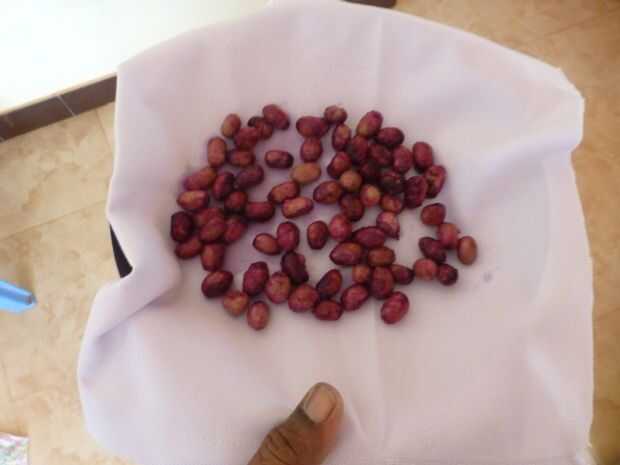 Extender las semillas en un paño limpio y mantenerlo en el sol para secar. Después de dos o tres días en el sol, la cáscara externa se vuelve floja y puede muy fácilmente ser pelada.