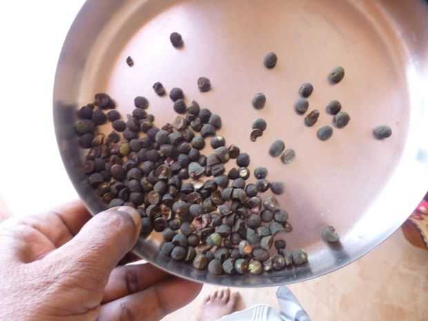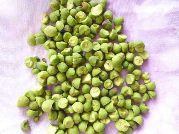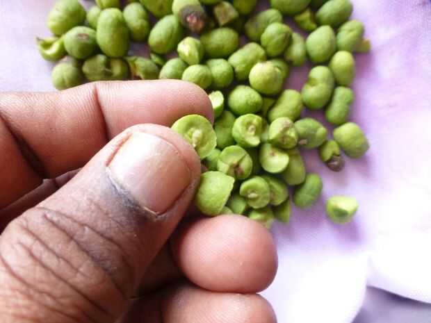 El núcleo interno verde puede romperse fácilmente en pedazos por presionando con los dedos, que acelerarán el proceso de secado. Mantenerlos al sol por algunos días más hasta que se secan completamente.