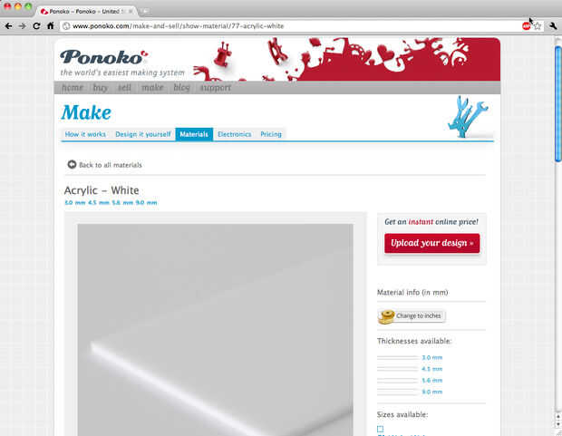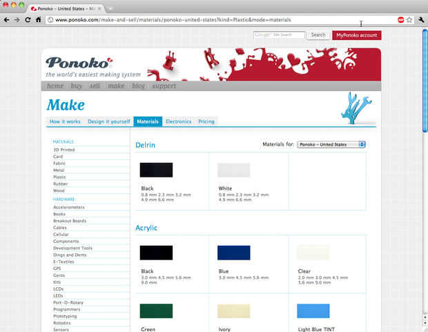 Navegación por el catálogo de materiales de Ponoko puede comparar materiales y decidir cual es mejor para usted.