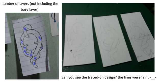 una vez que tienes averiguado, hacer una copia de tamaño real de su diseño y copie en el tablero de la ilustración. Usted puede hacer esto por trazado sobre papel con un bolígrafo. copiar varias veces, dependiendo de la mayor cantidad de capas + 1 capa más como la base, donde todo va pegado a.