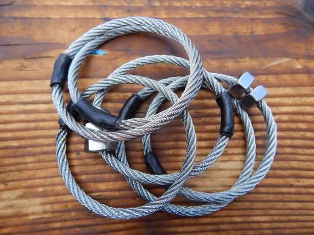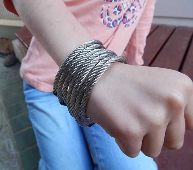 En mi trabajo que utilizamos la cuerda de alambre de acero inoxidable de 4mm suspender bombas de agua sumergibles abajo agujerear los agujeros. Con frecuencia nos quedamos con cortos sobrantes que generalmente se desperdiciaría. Usé algunos de este cable de sobra para hacer unos brazaletes cool para mi hija.