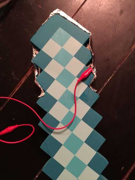Utilizando uno de los clips incluyen con Makey Makey - Conecte el conductor al papel de estaño. Utilice pegamento caliente para fijar el cable a la parte posterior de la espada - esto evita que el plomo de ripeo a través del papel de estaño.