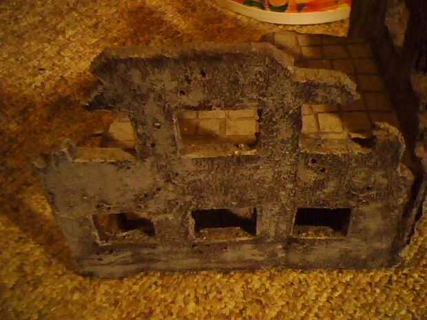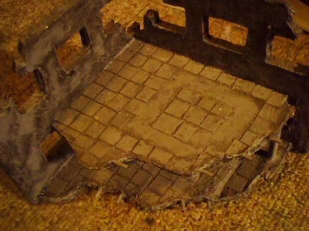 Ahora añadir adornos y batalla asustar, dependiendo de qué tipo de batalla, su voluntad o bien quieren cortar pequeño rasguño como espada cortes en las paredes y añadir pequeños palillos en racimos, espigas o lanzas, he añadido los agujeros de bala de varios tamaños que se asemejan a diferentes calibres de las armas y también cortar pequeñas secciones alrededor de una ventana o dos para añadir a daño de batalla , algunos tallados en tarjeta, apenas algunos con el dedo pulgar, empuje cuando textura parece daños estructurales en la pared como que se desmorona dentro de shockwave daño... luego tu arena! uso la multa arena para esto y conseguir una cantidad media de aguadas de pintura de la pared de emulsión cualquier color hacer y añadir unos pinches grandes de la arena a la mezcla ahora aplicarán esta pintura arenosa a las paredes de la tarjeta de su edificio en todas partes y dejaron secar algunos, entonces utilizar el último de la pintura de textura en el edificio en partes donde la arena es desigual en las paredes difundirlo alrededor y obtener uniformemente distribuida en las paredes y en los agujeros de bala o cortes de espada cortado previamente... dejar secar por un tiempo pasado, dejar por 24 horas + esta vez, puede tomar un tiempo seco y duro.