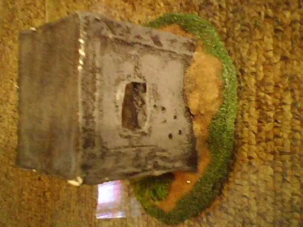 Caja de caja tamaño Bunker: píldora la píldora búnker para una sola o 2 hombre equipo utilizando armas pesadas portátil hombre, como lanzamisiles, lascannons, francotiradores, etc.... Otra vez tome su cartón y corte para el tamaño de usted y la forma que desee de su bunker y corta un puerto ventana o disparo de una sección, ahora corte los lados de la parte inferior y superior, habrá ninguna trasera esto es una ejecución en algún material de correr tipo de búnker del campo para romper grandes bunkers, o llenar el hueco en la línea de bunkers será una pequeña , dejarlo seco uso hotglue para crear el global bunker forma, luego cortar la base, una forma oval agradable elegir y utilizar, pegamento del búnker de la caja a la base ha cortado, luego rellenar con pegamento caliente o de relleno todos los agujeros de la tarjeta acanalada por lo que no hay agujeros cualquier extra o sobre derrames de arena y no te olvides de rellenar los agujeros de la tarjeta en la sección de ventana sin llenando la ventana del búnker, dejar secar sin embargo mucho es esperado pegamento caliente alrededor de 10 minutos, relleno más horas en un lugar seco y caliente en el sol, asoman en algunos agujeros de bala con un vice de pin o un destornillador pequeño, luego pintar en una descafeinada con textura arena y emulsión de pared pintura mezcla, lo dejas secar una buena cantidad de tiempo en un lugar seco y aplicar una capa negra para la licencia de bunker todo que se seque, luego pase y overbrush pintura gris sobre el bunker, captura de partículas de arena en la pared con textura como que avanza hasta que es todo elegido muy bien, use una cantidad lejos de pincel seco dejando marcas blackend bajo el gris como si las marcas de la quemadura o daño, una vez seco del calor , aplique flock verde (polvo verde) o pase la base en un gris también si desea un paisaje lunar alrededor del exterior del búnker, utilicé verde rebaño, y un poco de matorral de modelo, para hacer este corte hasta una vieja esponja y remoje en pintura verde, luego dejar secar, triturar un poco y romper para arriba , hay un arbusto poco modelo tamaño Aplique pegamento PVA en pequeñas partes y espolvorear en alguna arena de rebaño etc para más efecto, dejar secar y su pequeño búnker está hecho, añadir cualquier retoques con negro una pintura gris de virutas y escamas durante el secado de procesos... y utilizarlo en sus juegos de guerra.