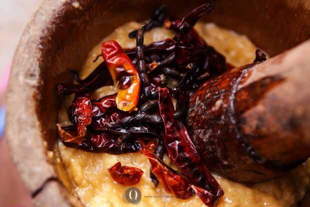 2. Agregue la páprika seca y granos de pimienta. Sin embargo puede moler estas dos especias antes para reducir la cantidad de golpes tiempo. Para que sea más fácil para la molienda, sumerja ambas especias en agua unos minutos antes de empezar y molerlos en un Asanka. Preferí agregar en conjunto para una mayor infusión de la pimienta.