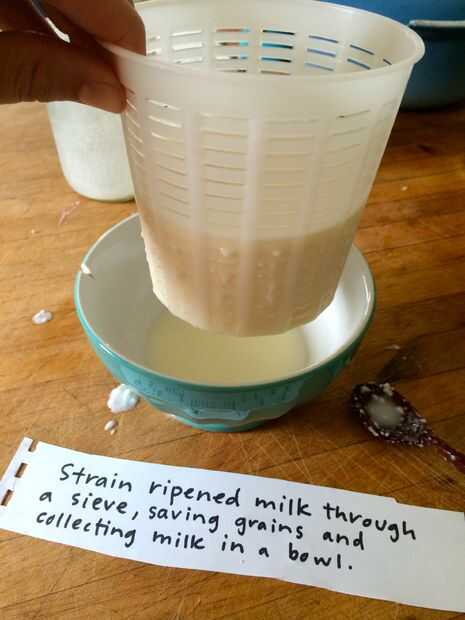 Cuando ha pasado suficiente tiempo, colar la leche. Esto es tan simple como vertiendo el contenido de la jarra en un colador o tamiz. Mantenga el colador sobre un recipiente para recoger la leche madura. Dejado será su kéfir. Con el tiempo, los granos comenzará a múltiples por lo que tendrás más y más.