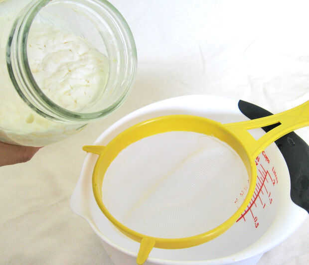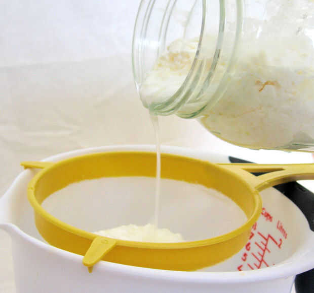* Usted puede notar el suero claro filtra primero, seguido por la parte más gruesa de cuajada blanco cremoso. Algunas personas prefieren mezclar el suero para un kéfir más suave, más grueso. Esto no es necesario, y también que desechar muchos valiosos minerales y proteínas que se encuentran en el suero.