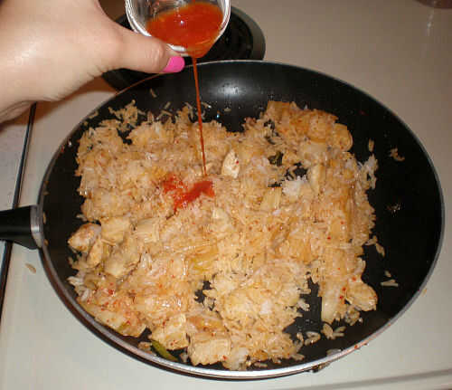 Nota: Cuanto más líquido se agrega el kimchi más sabor y especias el arroz frito tendrá. Seguir a mezclar los ingredientes hasta que el líquido se ha distribuido bien.
