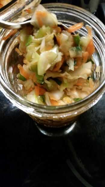 Ahora transfiera todos los ingredientes en su tarro de masón y presione hacia abajo para que todo el jugo llega a la parte superior cubriendo el Kimchi (Asegúrese de dejar espacio en la parte superior de 1 pulgada). Ponga la tapa en bien y dejar reposar en el mostrador de la cocina durante 3-7 días (cada día abrir la tapa para liberar algunos de los gases). Prueba después de 3 día de cocción deseada. Debe tener un sabor escabeche. El nivel de "hacer sentido" te gusta y el nivel de acidez que te gusta son las preferencias individuales. Cuando termine, guarde en su refrigerador. El Kimchi puede durar hasta 2 a 3 años en su refrigerador. Usted sabrá si es finalmente descarrilada si hay moho o si tiene un sabor algo agrio y gaseosas. Pero si eres como yo y te gusta, probablemente no durará más de unos pocos días. Sugiero a partir de otro lote en su contra tan pronto como pones en el refrigerador porque usted no querrá estar sin él.