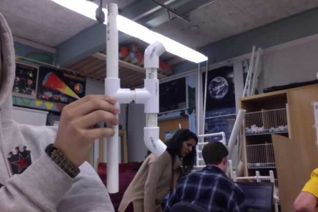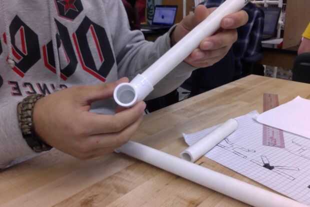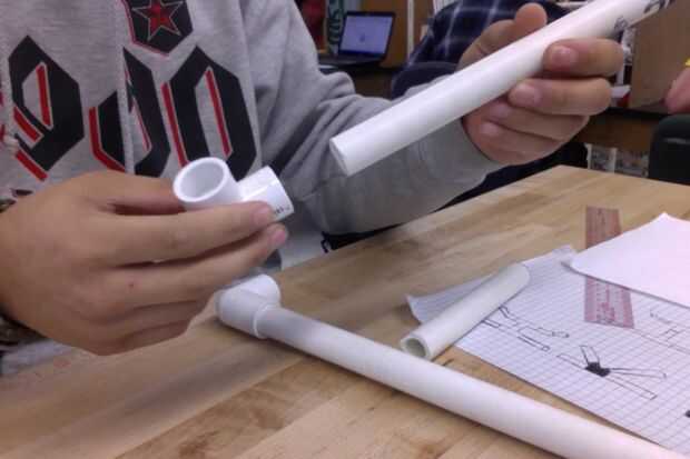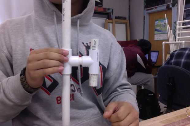 2.) de la foto dos y tres, conecte el conector T el pvc de 8 pulgadas. Conecte las 2 pulgadas al otro conector T y poner dos tubos de PVC de 2 pulgadas y conectores de 45 grados en los extremos. Coloque otro 2 pulgadas PVC en los extremos del conector de 45 grados.