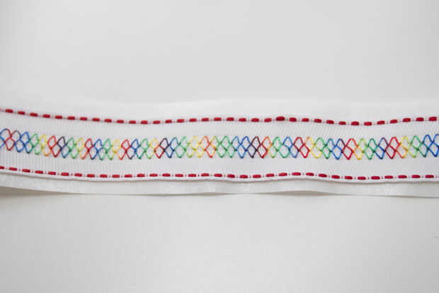 Centro de la cinta de debajo del pie prensatela para que el diseño se coserá por el medio. Empezar a coser, manteniendo la cinta centrado y plano para que las puntadas se mantengan incluso. Cuando se realiza mientras que sostiene el área de cosido con una mano y lentamente rasgar lejos el estabilizador en un lado con el otro. Luego rasgar lejos al otro lado.