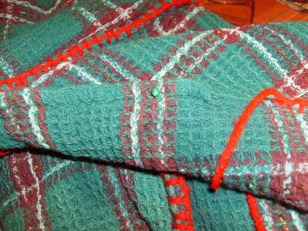 Pin y coser dos toallas juntos lados largos con la puntada de manta, continuar agregando otra toalla hasta que quede una fila de toallas la longitud de la cama. Hay ocho en toallas en cada una de las filas de la tesis. Hice cuatro series de ocho. (32 toallas)