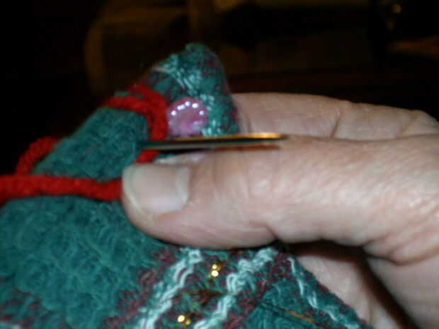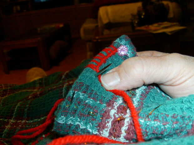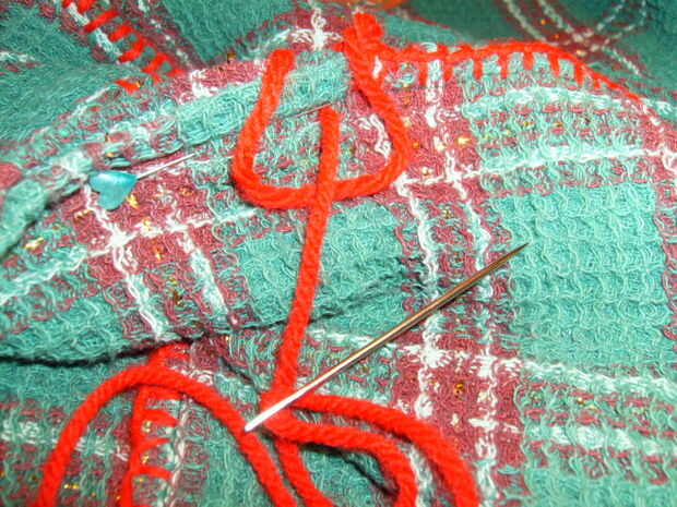 Enhebrar la aguja con unas 3 yardas (más o menos) de hilo ya sería mucho para manejar. Anudar un extremo del hilo. Tire de hilado a través de hacer puntada de manta. (ver fotos)