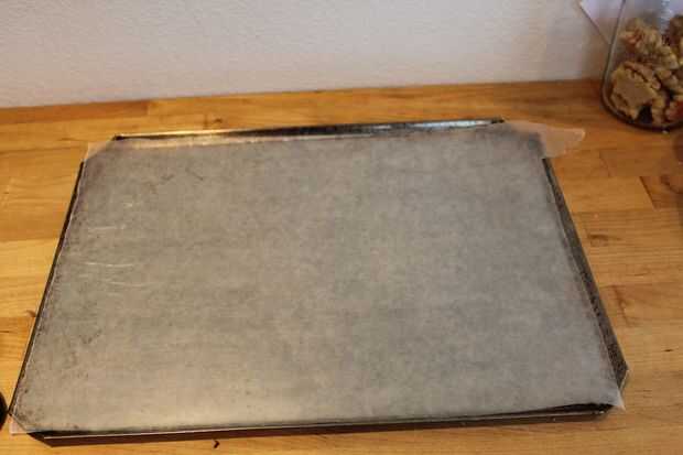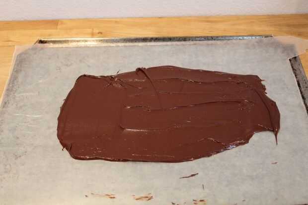 Preparar para hornear poniendo algunos ontop de papel de cera/pergamino de la misma, asegurándose que esté perfectamente plana. difundir chocolate derretido con una espátula de silicona (preferentemente) en el papel de cera con cuidado, usando su mano para sostener el papel encerado en lugar. Extendió hasta planas y delgadas como se muestra.