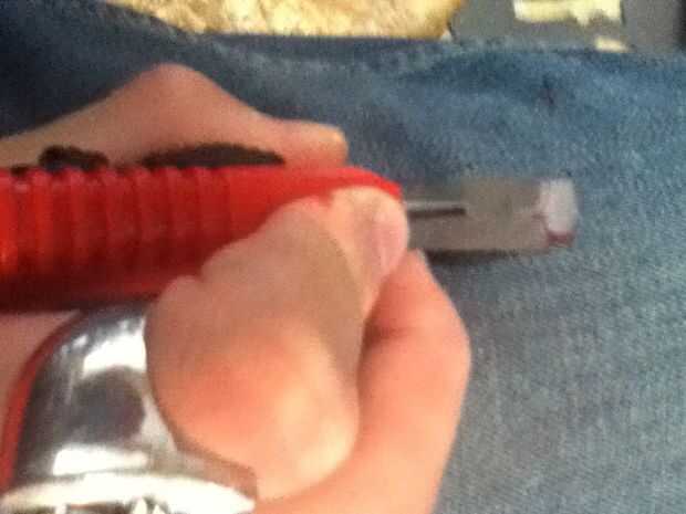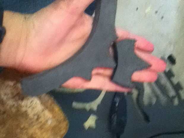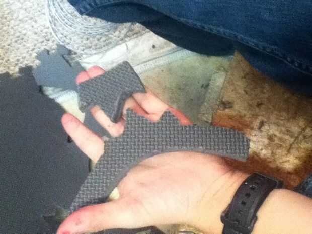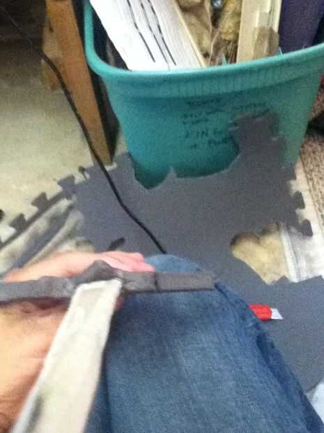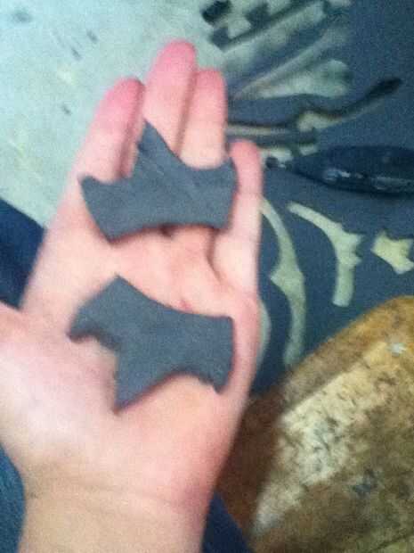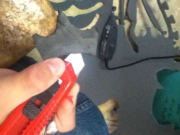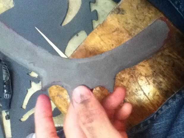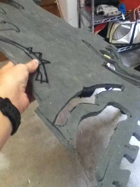 Así que su rastro de estera de espuma el contorno de la chapa (que es la parte que protege la mano) y los tres con piezas que van en la parte superior. Recortar cuidadosamente las dos piezas y que tenga que hacer un par de veces para hacer las cosas bien. Tuve que hacer 3 veces. Que utilice la Dremal y tijeras para refinar los bordes. De nuevo utilice el Dreamel para sacar el lado malo (como me gusta llamarlo). Después de usted han hecho que a ambas piezas cortadas las tres tacon pieza por la mitad. Que corte un poco la raja en el centro de la pieza principal de la chapa, sólo lo suficientemente grande como para que usted pueda moverse sobre y en el lugar donde debe ir. Y la espuma podría romperse como lo hacen lo que tendrás que hacerlo de nuevo.