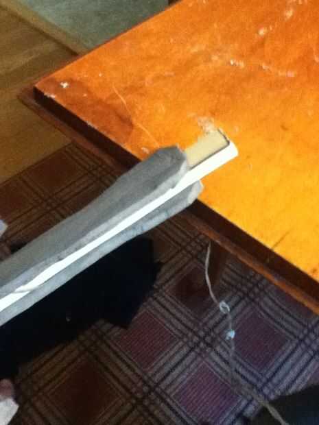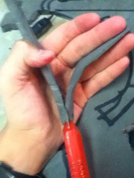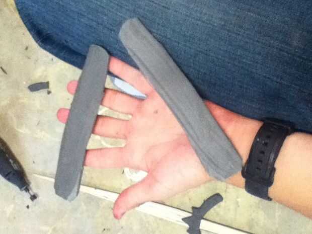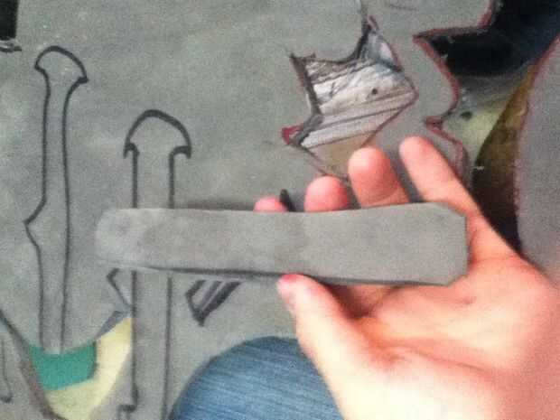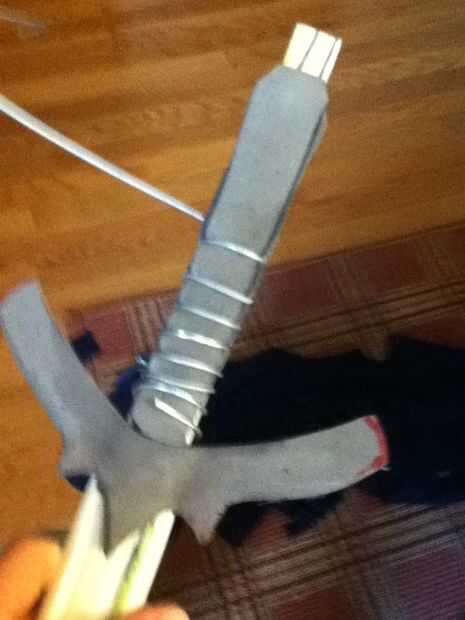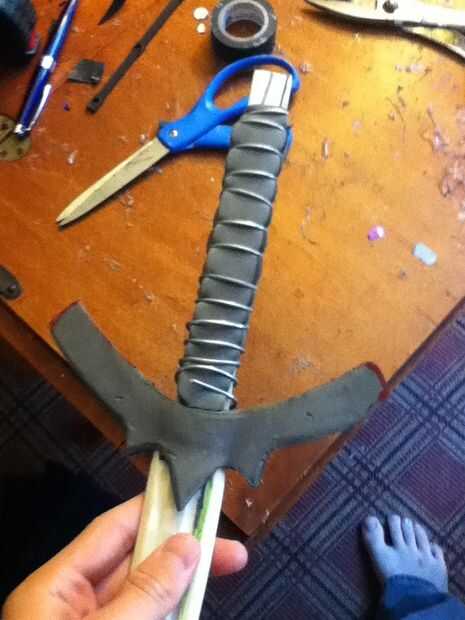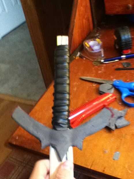 Trace y corte una forma de mango de que corte por la mitad y el lado malo de arena. Pegar a ambos lados de la espiga. A continuación enrolle alambre alrededor de la espuma que cubrir de cinta aislante.