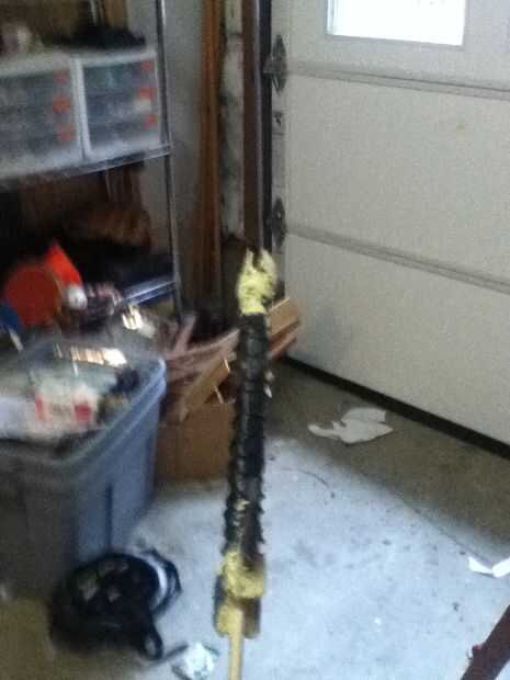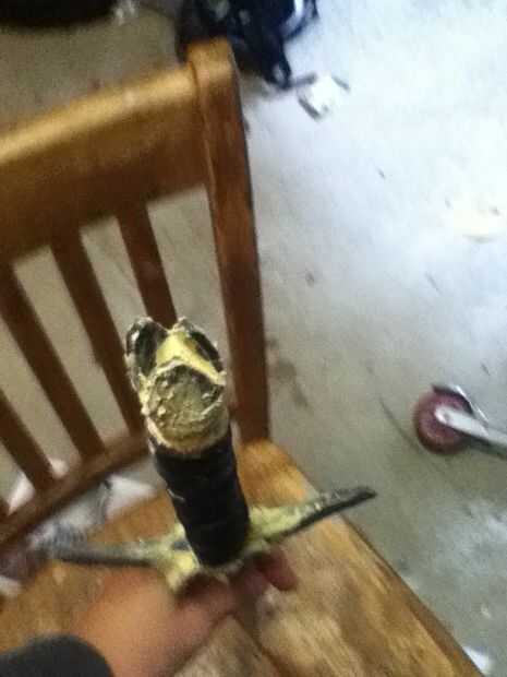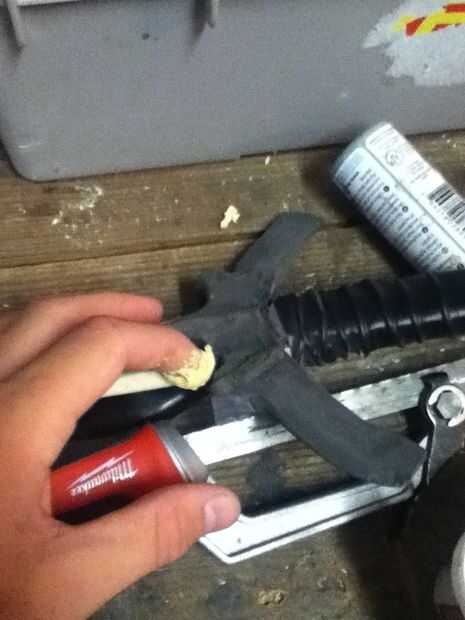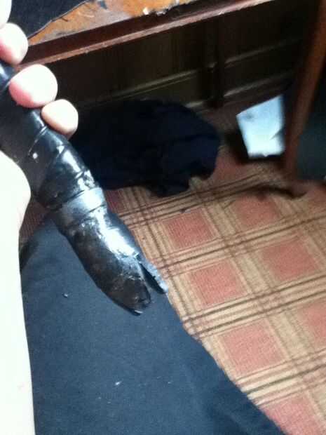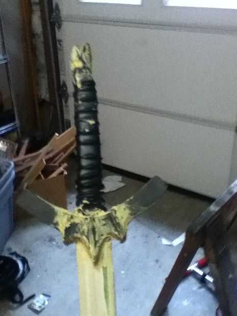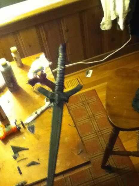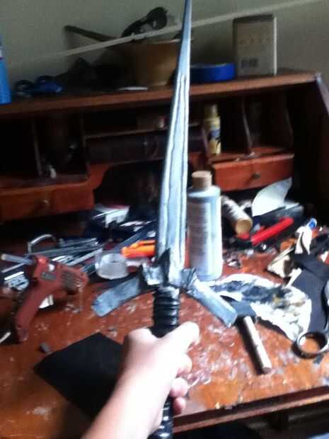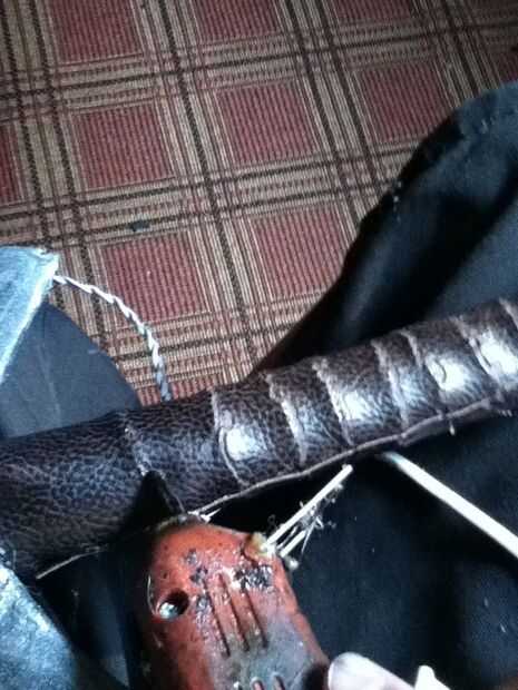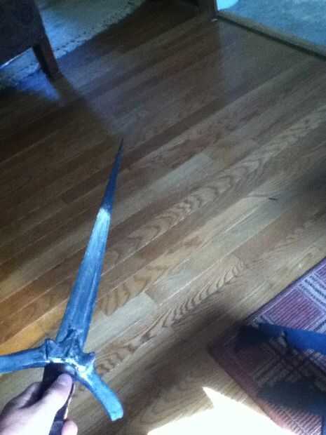 These are the last steps. Conseguir la masilla de madera (se recomienda usar de Elmer) y poner en todas las grietas en el guardamanos y el pomel que deje que seco. A continuación después de la arena seca masilla madera abajo con papel de lija hasta liso. Antes pinte hace un par de mellas en la lámina con la escofina, de arena hacia abajo un poco. Luego pintar todo negro excepto el mango cuando es seco pincel seco la plata de la hoja, Guardamanos y pomel. Hacer una segunda capa de la hoja de esperar a que seque. Que caliente tu pistola de pegamento y pegamento una tira de cuero o piel artificial me simplemente no podía permitir alrededor de la manija. Que utilizar la parte caliente de la pistola de pegamento y presione sobre el alambre a través de la piel artificial alrededor de todo el camino. Pegar o cortar cualquier termina de bajar y listo!!!