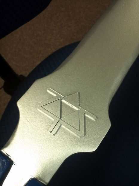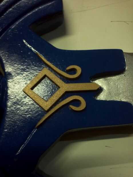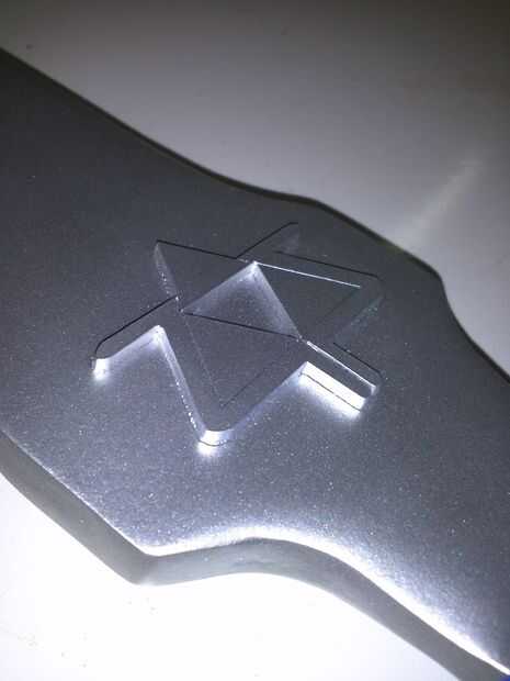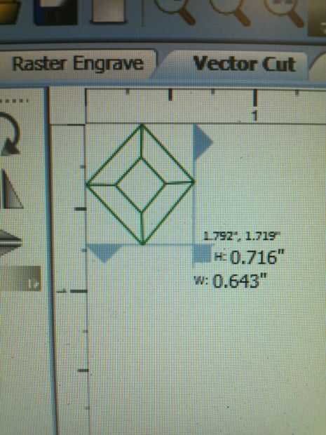 Luego hizo otro rastro de la imagen en Inkscape de la zona de la joya decorativa de la espada y cargué en el cortador del laser. Los el mismo acrílico como la Trifuerza corté. Para hacer la joya sólo corté la forma del diamante tres veces, reducir el tamaño del diamante en un 10% cada vez. Puse una gota de pegamento entre cada diamante y apilados para arriba. Hice otro juego de "decorados" por el otro lado de la espada.