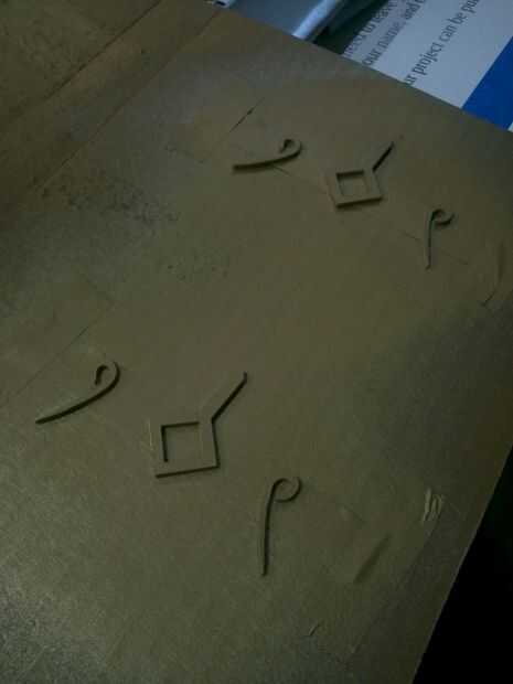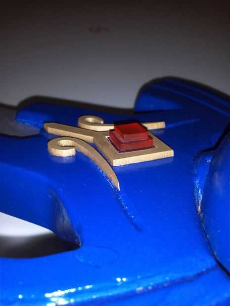 Entonces remonta las decoraciones en el área del ala donde iría con un cuchillo del exacto en la pintura. Luego utiliza el cuchillo para raspar la pintura para dar el pegamento un camino hasta la madera y pega las piezas en.