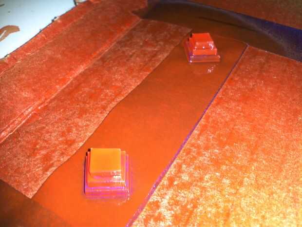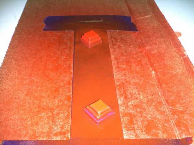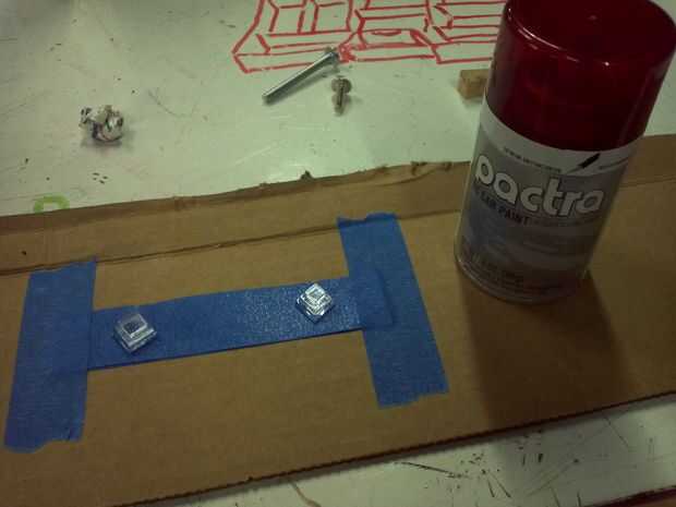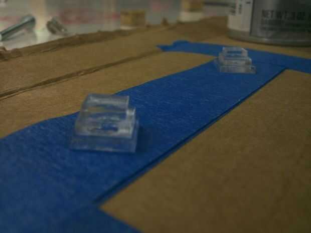 Me enteré de la manera dura que si simplemente poner estas piezas pequeñas en cartulina y tratar de les pintura de aerosol se van volando! Así que tuve que doble sobre alguna cinta de pintor para pegarlas a la cartulina por lo que yo podía pintar oro. Hice el mismo truco de la cinta con los diamantes y había pintado rojo translúcido.
