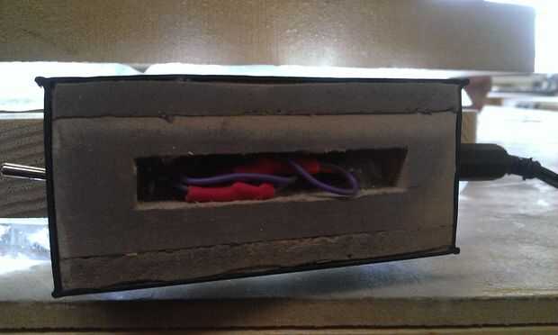 Las dos bodegas que han sido taladrados en los cables puede abeja alineados y el cable se pueden pase a través. Solde el cable positivo al interruptor primero luego el enchufe y el cable negativo hacia el enchufe. Aislar los cables y evitar que toque llena la base con pegamento caliente.
