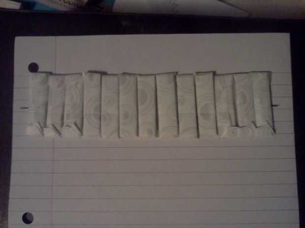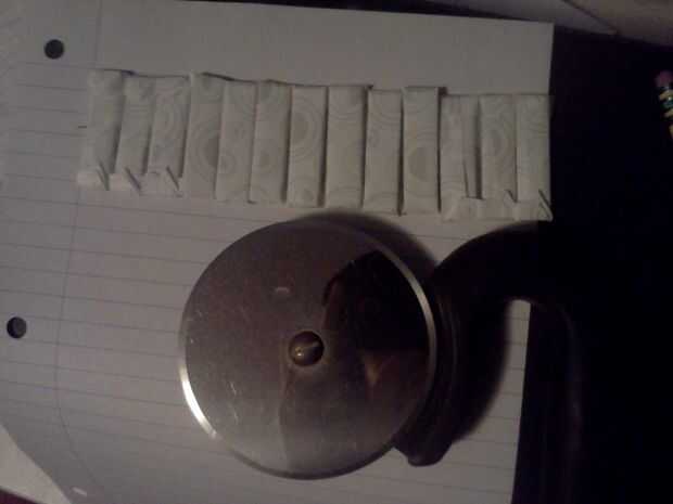 Qué vas a hacer ahora es un poco más complicado. En primer lugar, tomar una tira de la cinta lo suficientemente larga para que caben 7 piezas de goma en él. Luego, coloque 7 piezas de goma en él. hacer que la cinta está en la parte superior de las piezas de goma, o se va conseguir cortada cuando usted corta. hacer lo mismo dos veces más pero con sólo tres piezas de goma para ellos. Luego, vas a tomar dos trozos de cinta y ponerlos para que ambos de sus lados pegajosos toquen. Luego, coloque uno de los lados pegajosos en la parte posterior de la tira de siete, luego hacer lo mismo a una de las piezas de tres (ver la foto). Volver a hacerlo para el otro lado. Luego, tome un pedazo de la goma y alinéelo en un pedazo de papel, para que la parte superior de la misma está bajo la primera línea. Marque con un lápiz sobre el papel que marca Dónde está el centro de la vara de goma. Luego, tomar la tira de 13 y ponerlo todo en una línea. El cortador de la pizza es útil aquí, como solo usted puede rodar de un lado a otro, pero si no tienes uno, puede hacer una marca en la goma y utilizar las tijeras para cortarlo.