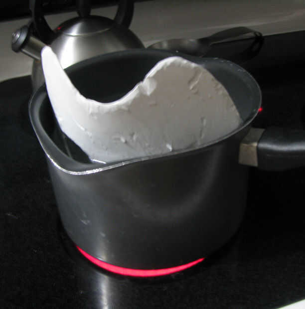 Hervir algo de agua. Preferiblemente más grande que esto, por lo que realmente puede ponerse la mascarilla interior. Coloque su cintra en el bote hasta maleable. Quite rápidamente y trate de no quemar las manos. La máscara de la curva con la mano. Ser rápido, ya que endurece pronto después de salir el calor. Si no te gusta la forma, tirar hacia atrás en el agua y vuelva a intentarlo.