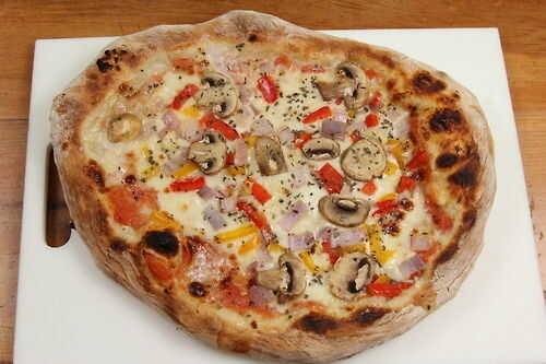 Finalmente, transferir la pizza a una tabla de cortar con la piel. Cortar, servir, disfrutar inmediatamente!