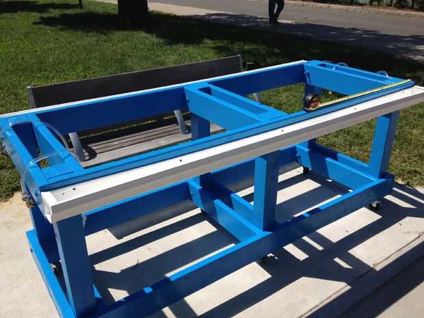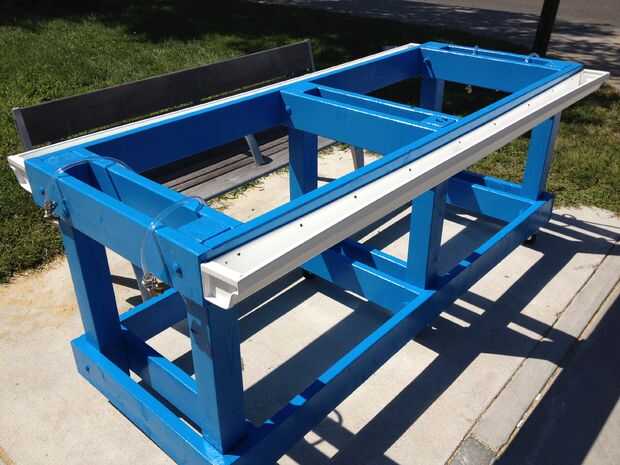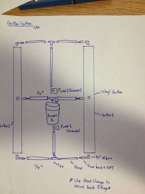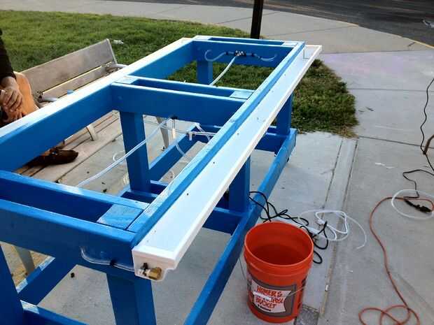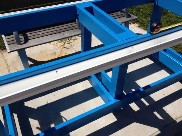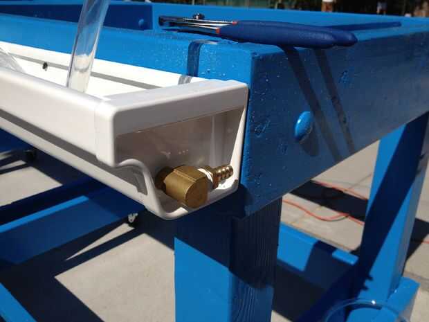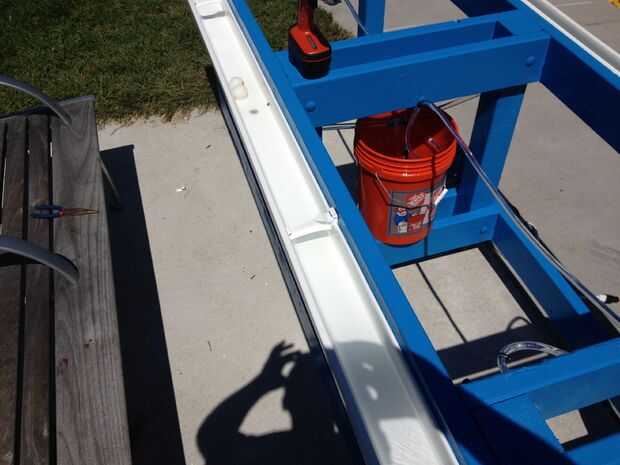 1) comienza por cortar los canales con el tamaño correcto para ambos lados de la mesa. Una vez cortada, colocar a ambos lados de la tabla utilizando los ganchos de canalón. Coloque el centro del canal de 1.5" de la parte superior y los extremos 1" de la parte superior, dando una pendiente a la cuneta donde eventualmente se piscina en el centro.