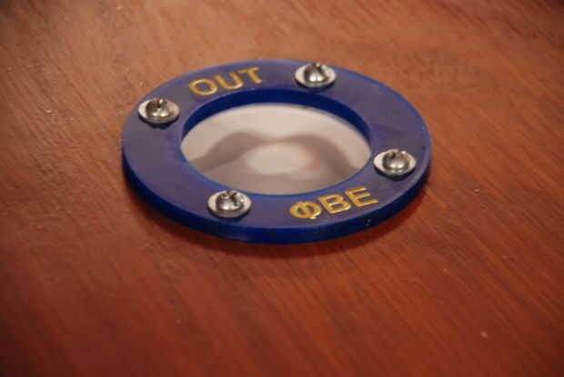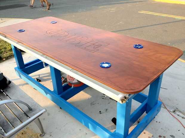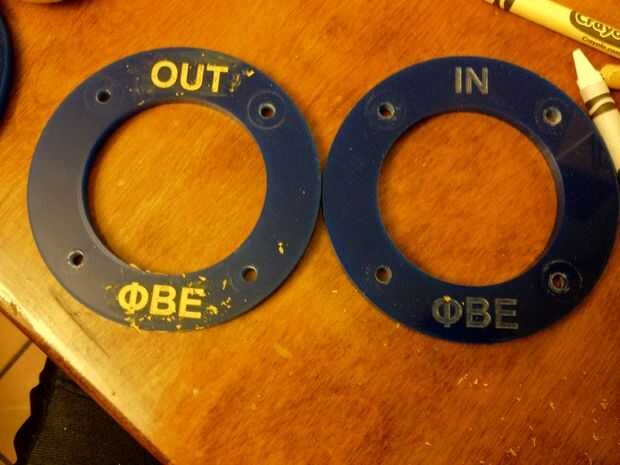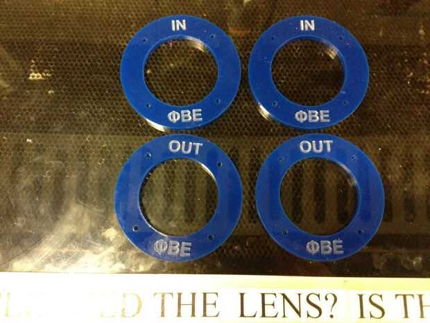 2) cortar los anillos vistos en la parte superior de la tabla. Si tienes acceso a un cortador del laser, puede hacer algunos diseños muy cool. Asegúrese de que el interior radio del anillo corta cubrirá el orificio y tubo de PVC de la lavadora bola por lo que no se pega para arriba.